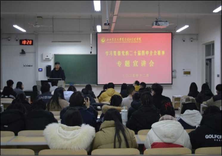 为深入学习贯彻党的二十届四中全会精神。12月18日,农业经济管理学院于勤学楼B栋306开展学习贯彻党的二十届四中全会精神专题宣讲会。此次宣讲会邀请到了马克思主义学院刘宇老师主讲,院党委副书记郭旭耀主持会议,分团委副书记李二雷及全体学生党员参加。