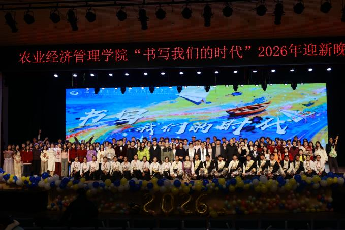12月25日晚,农业经济管理学院2026年“书写我们的时代”迎新晚会在勤学楼行远堂隆重举行。校党委副书记李卫祥,学工部部长原广华,校团委书记冯伟,院党委书记冯巧兰,院长邵林生,院党委副书记郭旭耀,副院长赵敏出席此次活动,学校各职能处室老师以及兄弟学院团干辅导员等与学院近千名同学一同观看晚会。