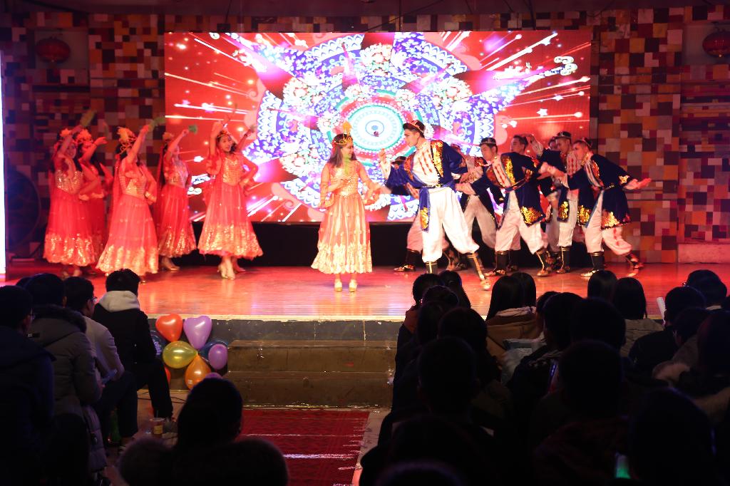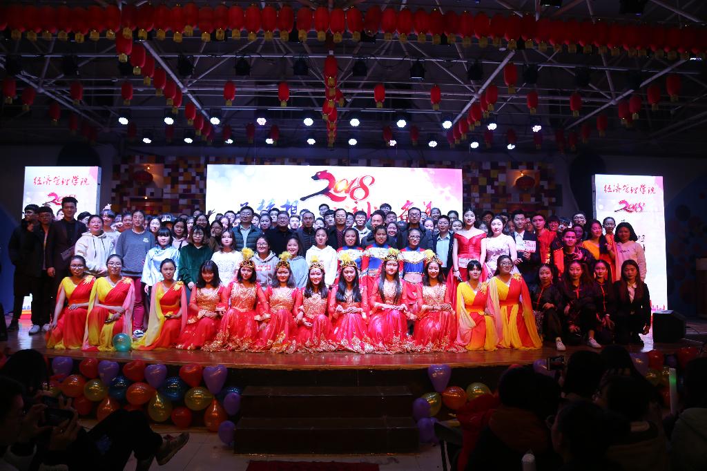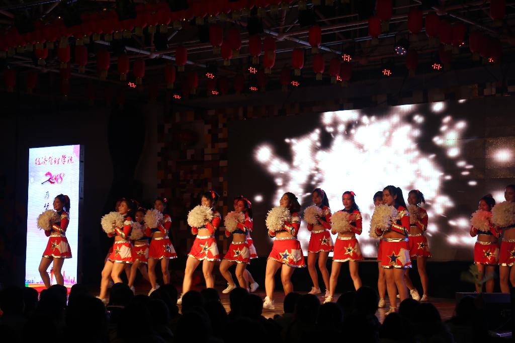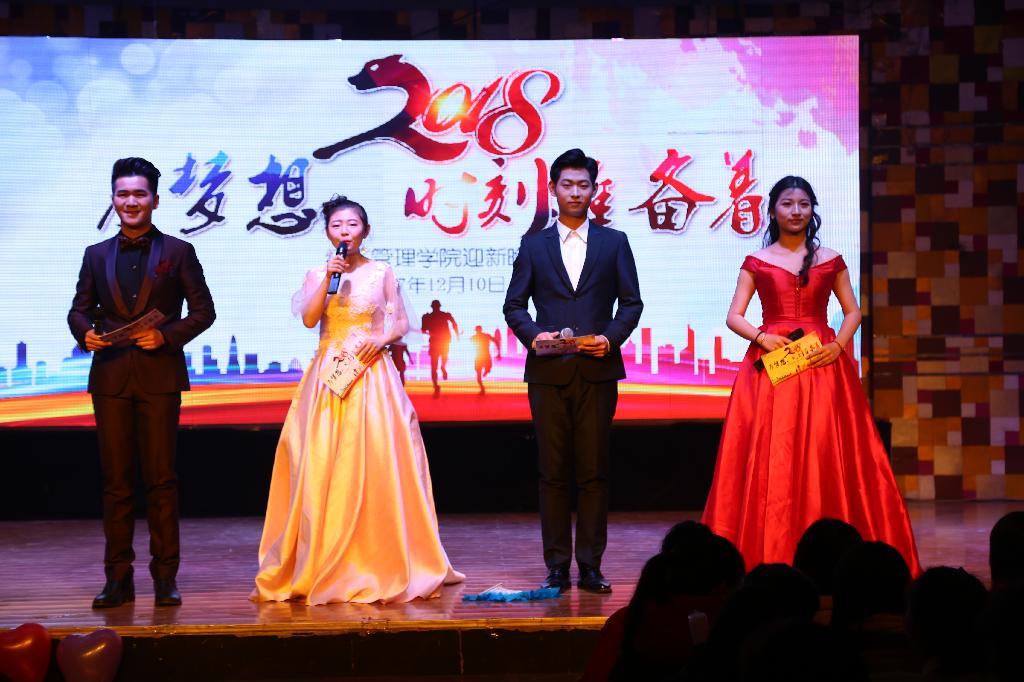 伴随着激昂的鼓点声、舞动的双臂,《春归盛世齐欢歌》热闹的开场舞拉开了本场晚会的序幕。颁奖典礼上,学校和学院领导为获得国家奖学金、校长奖学金、国家励志奖学金、华革吴棋光爱心基金、优秀个人、先进集体的学生代表颁奖。颁奖典礼结束后,“为梦想,时刻准备着”迎新晚会在节目荧光啦啦操《为梦想,时刻准备着》表演中再次引入高潮。深情朗诵的《你是巍巍树参天》、引发现场观众对祖国的深切爱恋的合唱《我和我的祖国》、美轮美奂而又欢快的民舞《那孜库姆》、琵琶声、鼓声交相辉映的器乐合奏《十面埋伏》、幽默而又暖心的小品《拜托了,教练》、展现经管学子商务礼仪风采的礼仪风采展《贝加尔湖畔》、传统文化与现代舞蹈因素碰撞的街舞《大圣归来》、独唱《推开世界的大门》承载梦想的信念、用动感与活力舞动青春的啦啦操《new stars》、歌曲串烧《大学故事》展现精彩的大学青春故事。整台晚会内容丰富,节目异彩纷呈,形式多样,引人入胜,高潮此起彼伏。最后,晚会在同学们期待已久的代班部长舞蹈《For you》中圆满落幕。