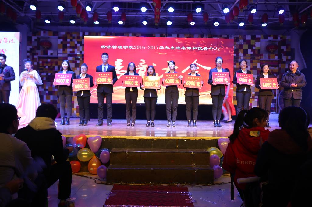 12月10日晚,经济管理学院在大学生活动中心举办“为梦想,时刻准备着”迎新晚会暨表彰大会。校党委宣传部部长元纪平、校党委学工部部长原广华、校党委组织部副部长郭志远、校党委学工部副部长弓俊红、校团委副书记朱江、校人事处副处长胡学峰、招就处副处长靳海波及校团委老师、其他学院领导老师与经管院党政领导、分团委老师、同学们欢聚一堂。