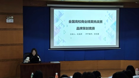 接着,杜胤娇详解全国高校商业精英挑战赛品牌策划竞赛。2026年赛事共设置品牌策划、数字营销、在华留学生3大赛道。竞赛形式为由3-5名选手搭配1-2名指导教师组成的团队参与。她着重强调了比赛注意事项以及我院案例和分享:参赛团队必须联系目标品牌方取得必要的授权,组委会提供统一授权书模板;在上一届品牌策划赛中,我院共有4支队伍取得优异成绩,分别获得全国总决赛一等奖一项、二等奖一项、三等奖两项。
