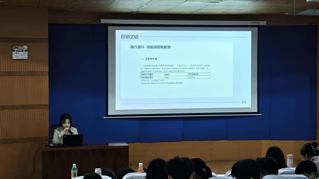率先开讲的刘羽聚焦“学创杯”全国大学生创业综合模拟大赛展开分享,先明确赛事核心:作为国家级A类赛事,去年吸引全国近1500所院校、30余万师生参赛,设创业、营销、财务三大赛道,上手简单且助力评奖保研。她重点拆解“营销之道”八大关键环节:先分析消费群体偏好、调研预测市场需求,再推进设计研发匹配用户需求;市场营销需谨慎报价(不超消费者预算),生产制造要兼顾市场需求与自身产能;产品配送结合营销策略规划(注意地区费用差异),直销部管好专卖店与大卖场,渠道部做好互联网及国内外经销商数据规划,各环节均需对照评分准则。