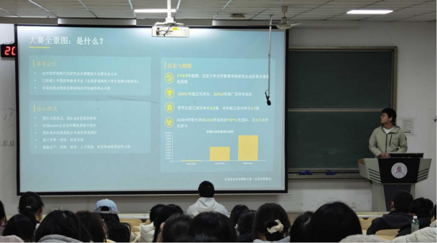 刘子文按时间线系统梳理大赛脉络,让同学们快速全面地掌握赛事核心背景。该大赛从1983年北京大学光华管理学院研发模拟系统的起源,到2001年正式举办、2010年推广至全国高校的发展历程,再到研究生组22届、本科组15届赛事的积淀,目前由中国管理现代化研究会决策模拟专业委员会主办,已纳入《全国普通高校大学生竞赛分析报告》,2024年吸引688所高校的9091支团队、近5万名师生参与。对于比赛环节,他逐一拆解关键信息:“每队3名成员需组建虚拟公司高层管理团队,在官方企业竞争模拟系统中完成多期经营决策,涵盖生产、营销、财务、人力资源、研发和战略规划等多个方面。”并针对决策赛道与运营赛道的差异作了对比解读。最后,荣获企业竞争模拟大赛全国一等奖的冯宇豪分享实战心得。他强调“认真准备”是取胜关键,鼓励参赛同学灵活运用官方提供的辅助决策工具,更科学合理地制定经营决策。