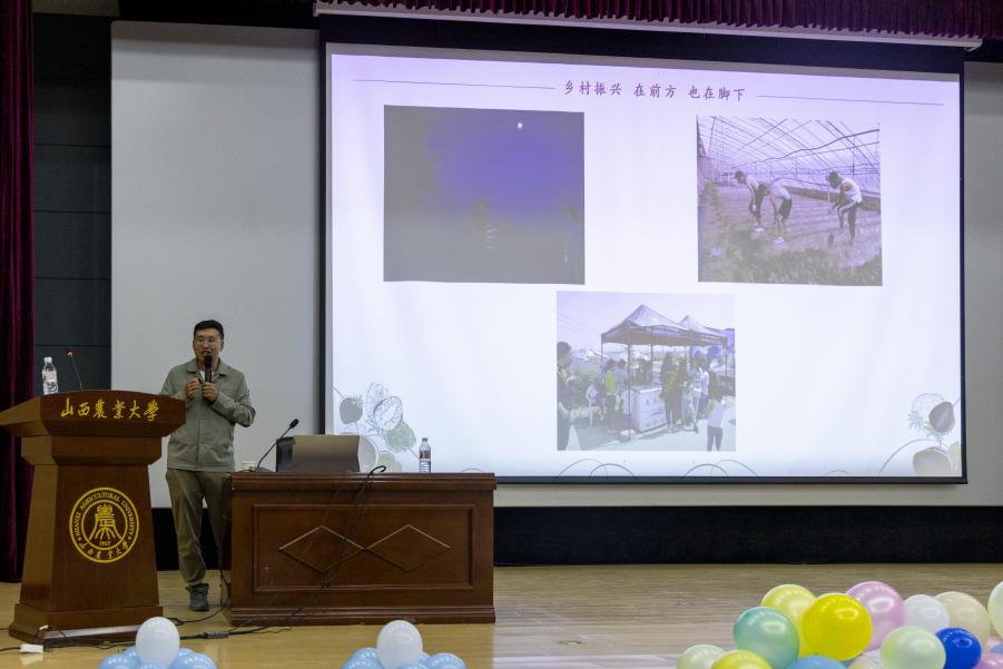 会议伊始,马红军以三阶段清晰讲述自己助力乡村振兴的历程:求学山西农业大学期间,他系统学习农学知识、关注农村发展痛点,通过课堂研讨与田间调研筑牢基础;毕业后,依托学校创业园支持开启创业路,秉持“学农、爱农”信念,公开联系电话对接农户需求;后续深耕生态农业,培育孕妇可食用的安全草莓,布局标准化农场与合作社,同时推广农产品、培育农业人才,并立志与山西农大学子携手助力乡村振兴。活动过程中,同学们认真聆听,现场学习氛围浓厚。